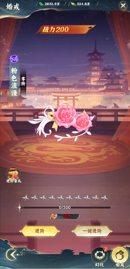 玩家结婚后开启,激活婚戒会获得战力提升,消耗婚戒碎片可以进行升星,婚戒可以消耗进阶丹来进行升阶。