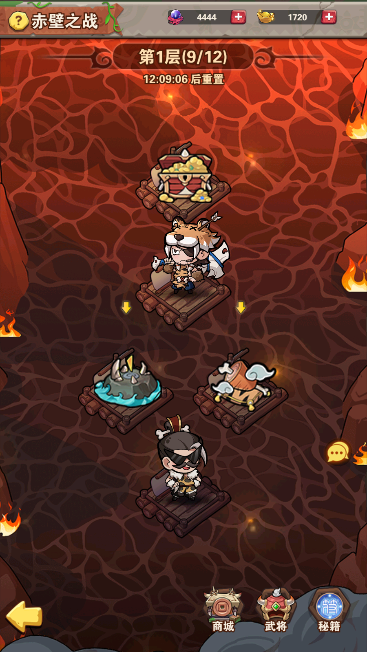 玩法可获取赤壁战功,进阶石和招募卷轴。赤壁战功可兑换武将碎片,根据所玩的阵容兑换所需要的阵营碎片。每层都会有增益buff,和复活武将以及恢复武将血量,武将选择