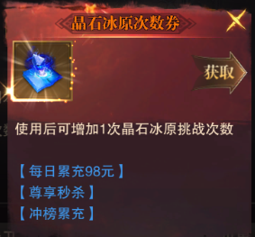 挑战机会:成为SVIP后可以通过花费20泰坦币来购买多1次挑战机会。也可以使用晶石冰原次数券来增加挑战次数。晶石冰原次数券获得的途径比较多,