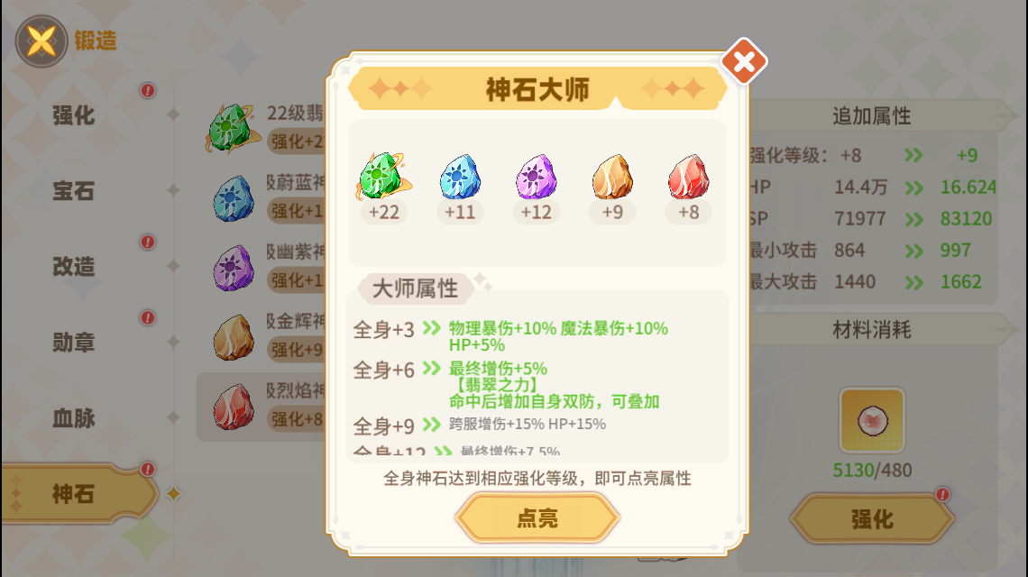神石有5种类型,玩家可在神石寂寞查看神石属性,消耗对应材料可对神石进行升级。